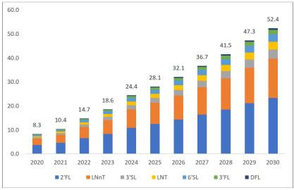 放荡2024年,算作HMO最主要、最老到的应用畛域,婴幼儿配方奶粉占据了环球HMO下流消费约90.7%的市集份额。