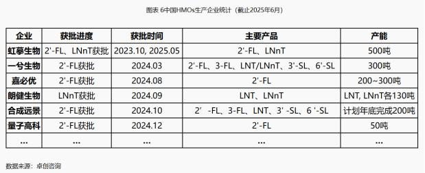 据卓创商讨统计,到2025年6月底,我国共有6家入口企业和6家原土企业的HMOs取得国度卫健委批准。当今,接近20种HMOs(多种母乳低聚糖的组合)居品取得国度卫生健康委员会批准为食物养分强化剂,我国已开导完成的母乳低聚糖产能超1500吨,在建产能在数千吨以上。