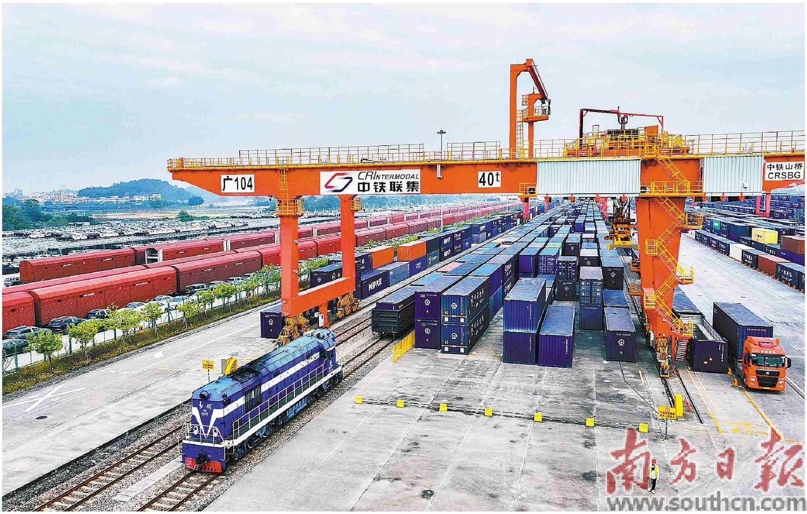 广州外洋港,集装箱整王人堆叠,龙门吊高效运转,班列有序编组发运,一片努力。南边日报记者张迪摄